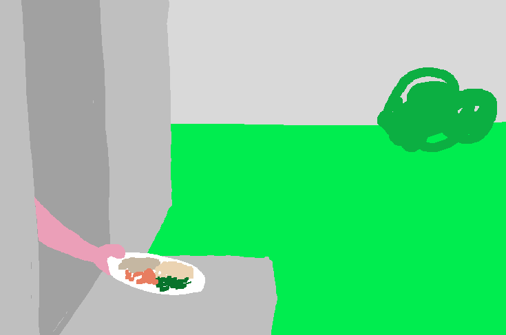 The RESIDENT deploys a HOT MEAL on his front stoop.
